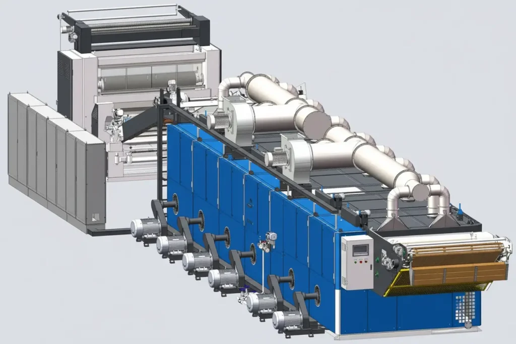 3. Hot Air Drying: Heaters (electric, steam, gas, or thermal oil) in the drying chamber heat the air, and powerful circulating fans force the hot air vertically through the fabric and conveyor belt from top to bottom or bottom to top. This through-flow heating is highly efficient and ensures even heating.